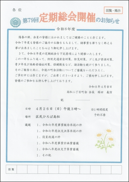 新しい年度に切り替わる前の一年を振り返り、その活動と次年度の行事予定について意見を出し合う総会を、区民ひろば高松にて4月26日(日)の15:00から開催いたします。1時間ほどの予定です。