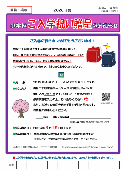 皆さまの大きな成長を願い、高松二丁目町会は心からの祝福を込めて町内にお住いの小学校新入生全員を対象にお祝い(図書カード)を贈呈いたします。町会員、私立公立の枠組みはありません。お申し込みは当ホームページからどうぞ。