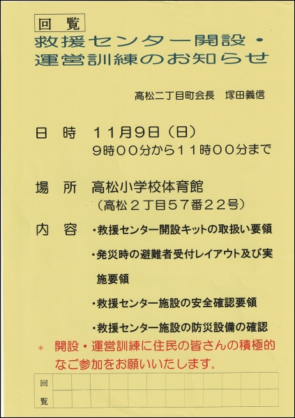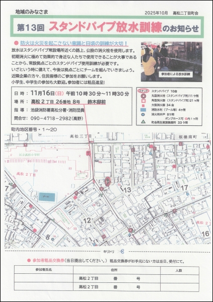 春と秋にあるスタンドパイプの訓練は第13回を迎えました。11月16日(日)10:30から高松小学校の南東、バス通りの信号を南へ降りた高松2-26-8が今回の訓練場所です。終了は11:30の予定。春に参加したのに使い方を今思い出せないのは、私だけでしょうか...。いざというときに迷いなく操作をできるように、この秋もご一緒に参加しましょう!